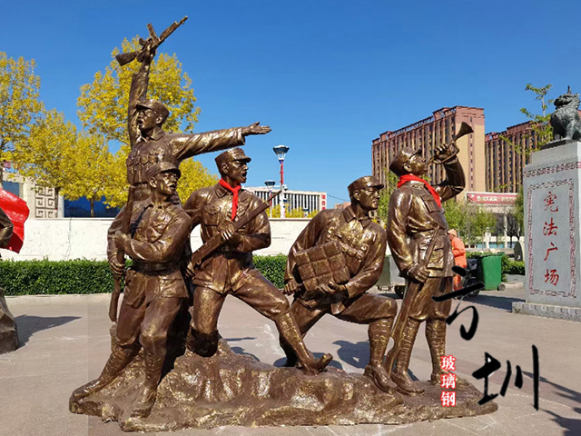 红色文化玻璃钢狼牙山五壮士雕塑是为部队文化或用于纪念意义而雕刻塑造、具有一定寓意、象征或象形的观赏物和纪念物。雕塑是造型艺术的一种。也是为了发扬广大的抗战精神特意为鼓舞人们而雕刻的雕塑。抗战题材雕塑大多都以抗战历史上的烈士为主,将那些为我们做出巨大贡献的烈士以一种雕塑的形象刻画出来,以此来表达对他们的纪念之情。